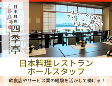 和食レストランのサービススタッフ【サービス経験者活躍中】毎週土曜17:00~の固定シフトでサクッと稼げる!隙間時間を活用して効率よく稼ぎたい方必見!ブランクあり、主ふさんやWワークにも◎